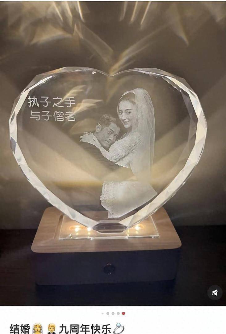 时光为证,平凡日子里,有你便是最好的时光。2026年4月18日,郭富城和方媛同时更新社交账号,庆祝结婚九周年。郭富城晒出与方媛的合照,单手比出"9"的手势,配文"长长久久、幸福美满"。方媛随后回应了那句"时光为证"的情话,还晒出了丈夫送的纪念礼物——一款定制水晶摆件,上面刻着两人的婚纱照剪影和"执子之手,与子偕老"的字样。